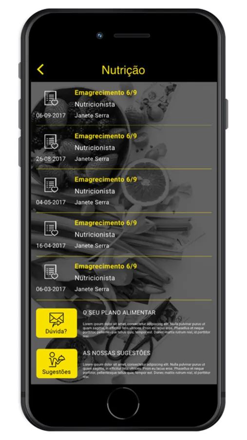 Após consulta com o nosso nutricionista no ginásio poderá consultar o seu Plano Nutricional, assim como ter acesso a dicas para melhorar o seu estilo de vida. Nesta área também poderá comunicar com o seu Nutricionista.