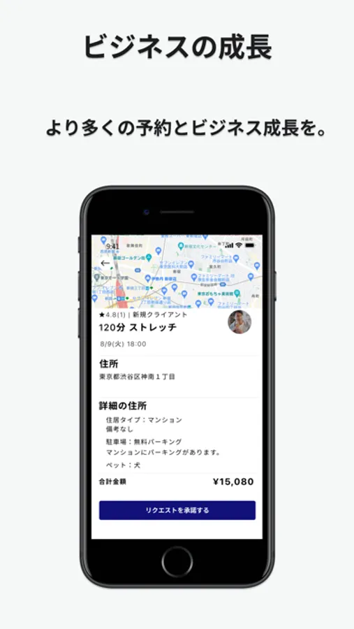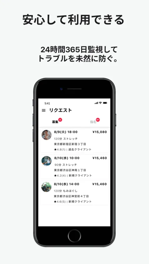 出勤可能日時を登録すると登録した日時、指名なし予約リクエストが届きます。リクエストを承認するとマッチング成立です。時間になったらお客様の元で施術してください。