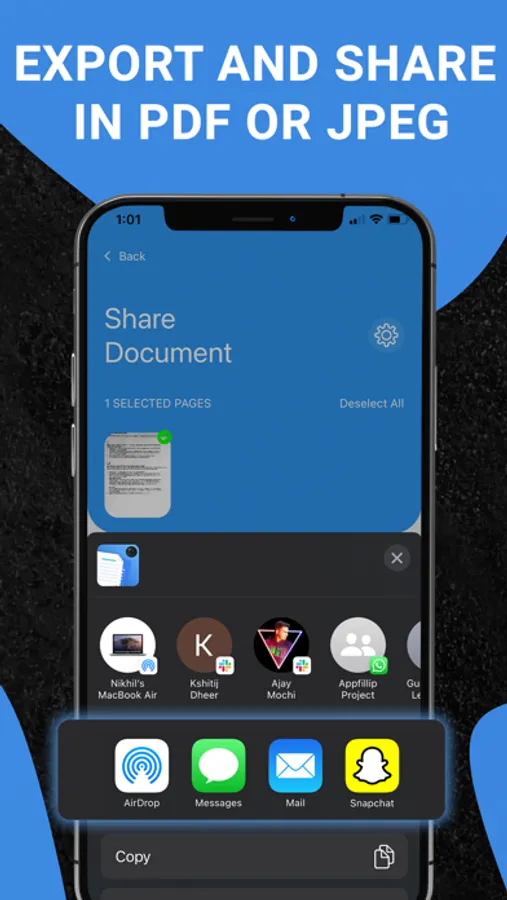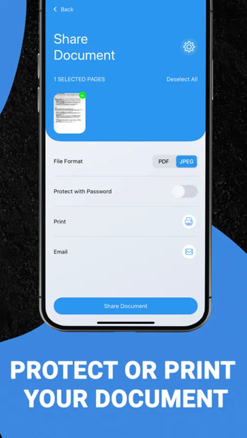 Email or message documents as PDF, JPEG, or PNG, or save to Photos