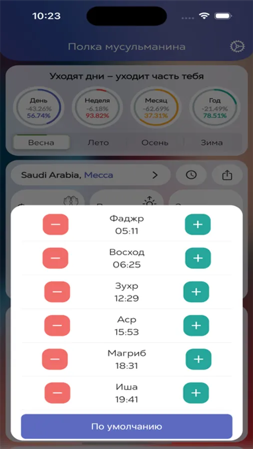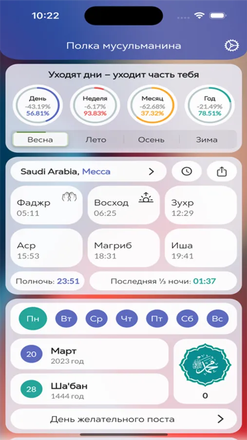Полка мусульманина – приложение, в котором вы можете следить за временем молитв, текущей датой по лунному и григорианскому календарям. Также вы можете увидеть прогресс текущего дня, недели, месяца и года. Можете воспользоваться главами с утренними, вечерними и ночными словами понимания Аллаха и многое-многое другое.