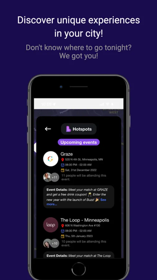 ● The hotspot feature allows users to view unique experiences and events in their area at any given time so they can plan their night accordingly.