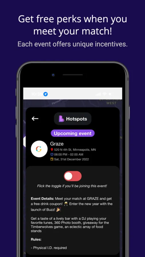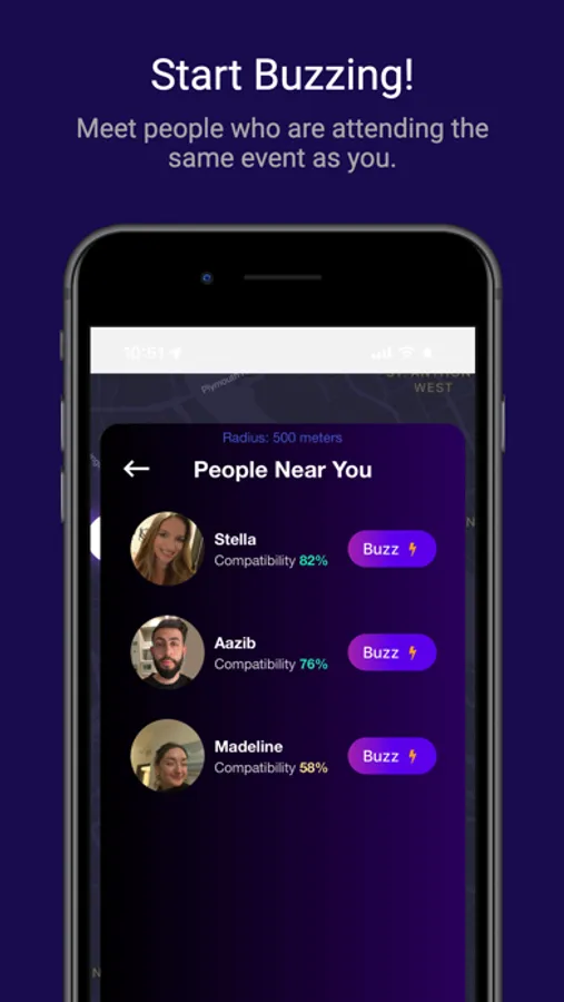 Buzz is a dating meets nightlife events App where users can find out about unique experiences and events near them, match at our partnered venues, and meet within minutes.