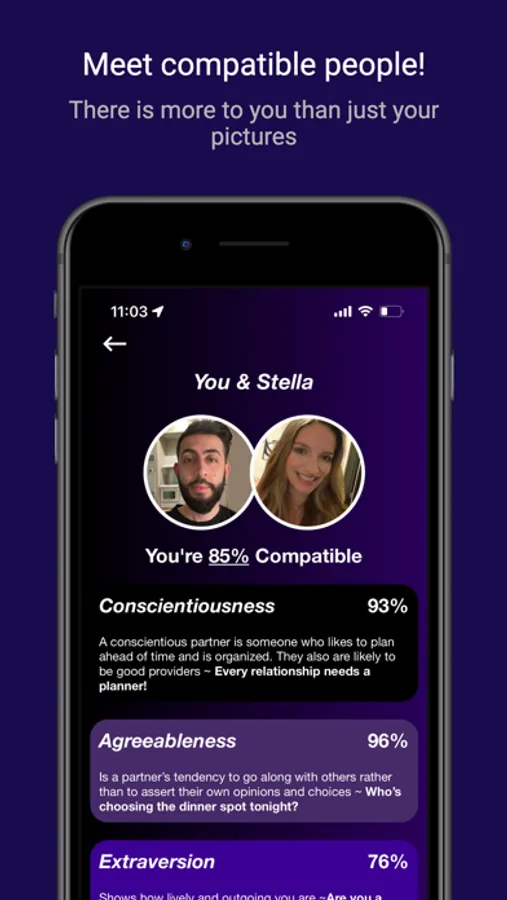 ● We believe there is more to people than just their physical appearance so we help users match based on our compatibility test to find others with similar traits.