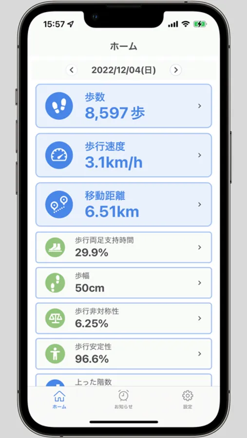 スマートフォンから収集した歩行や活動量に関するデータをもとに、各ユーザーへ個別のレポートを通知します。レポート通知は、おしらせページから確認することができ、日々の歩行状態の変化を振り返るきっかけに繋げることができます。