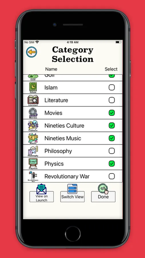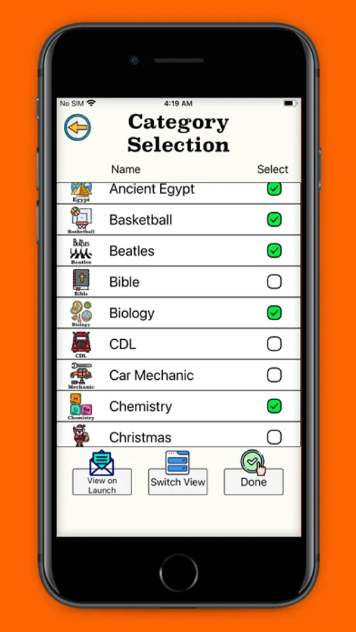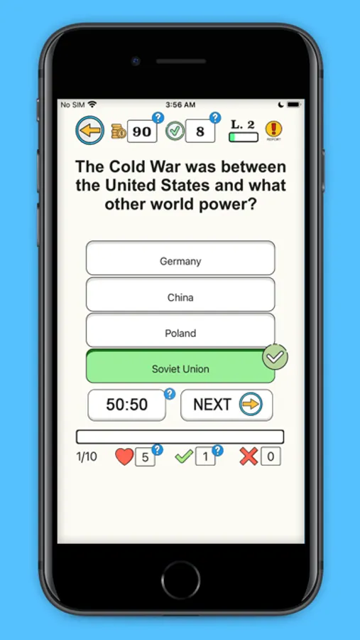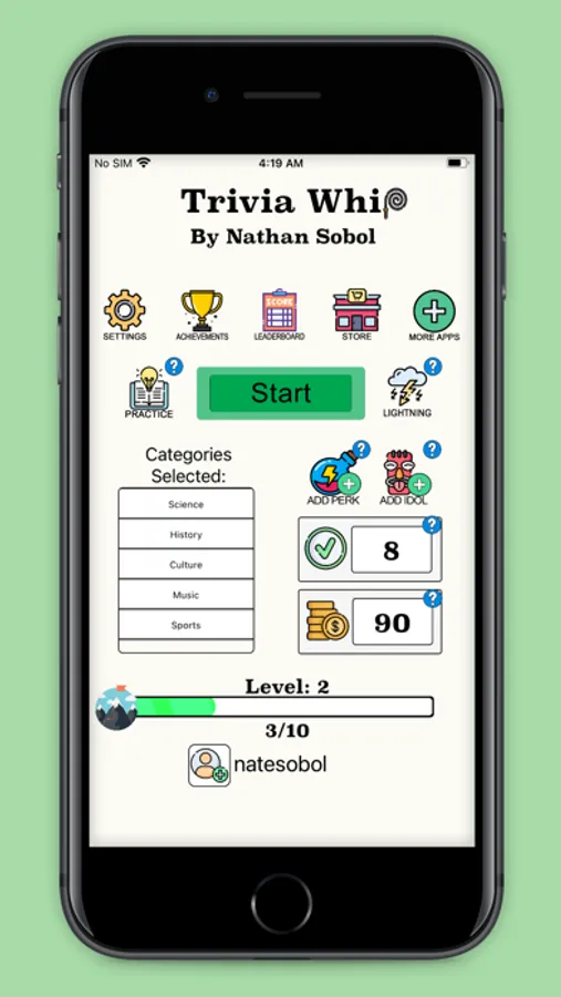 Trivia Whip is an engaging trivia game with tens of thousands of questions on many different trivia topics. Custom category selection allows you to filter trivia questions to your liking by category and subcategory. Progress with levels, earn coins, and buy perks in the store. Compete on the online leaderboard and earn achievements through Apple's Game Center. Use practice mode to disable lives and adjust your quiz length in the settings to hone your knowledge on any of the trivia categories. Join Bulby, your personal trivia assistant, on his adventure to WHIP you into a TRIVIA MASTER!