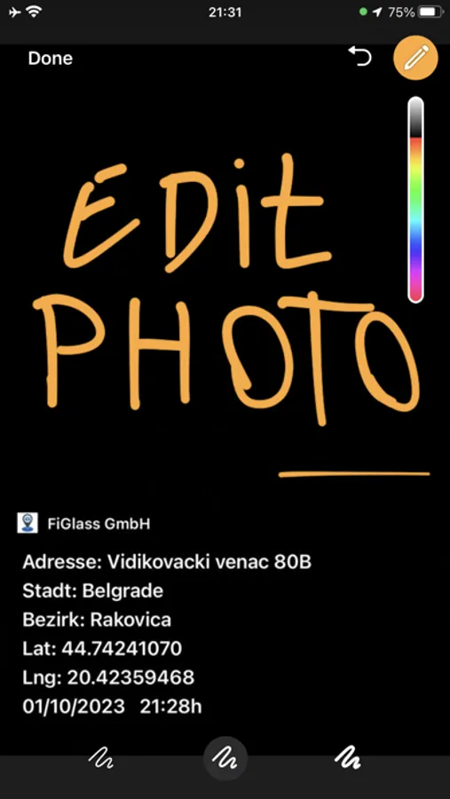 Ob Sie bei der Arbeit sind oder private Aufgaben erledigen, mit der FiGlass GPS-Kamera Fotostempel-Anwendung können Sie Datum-Uhrzeit, Breitengrad und Längengrad zu Ihren Bildergalerie hinzufügen.