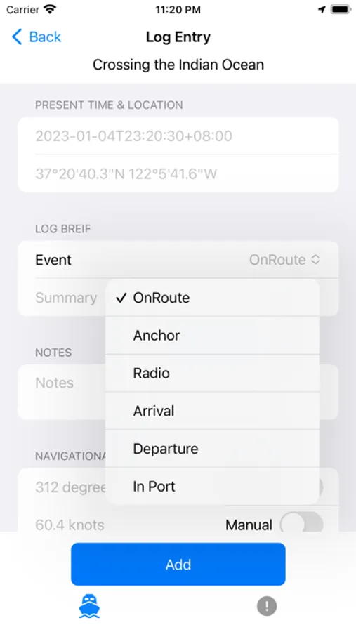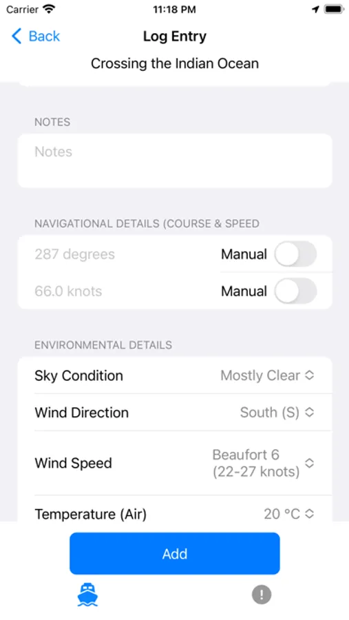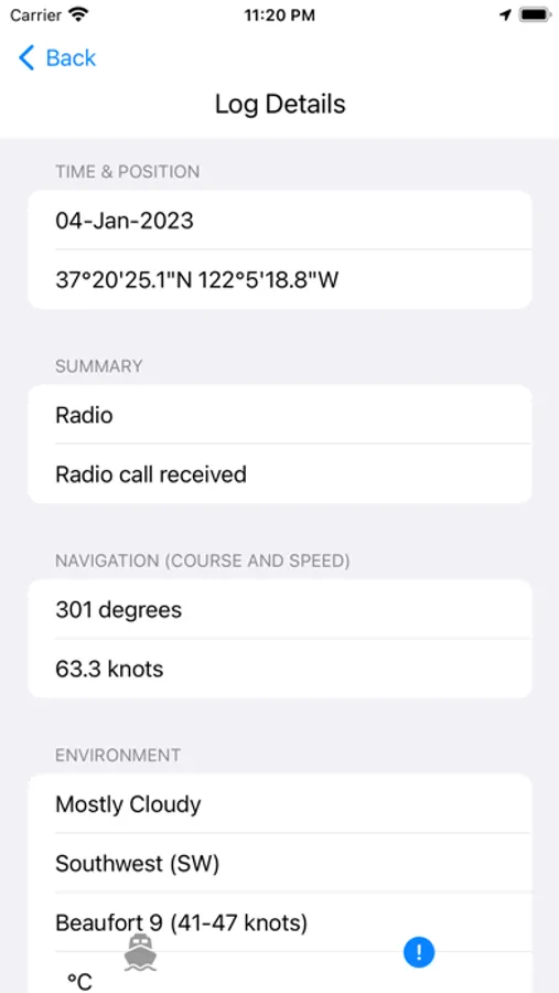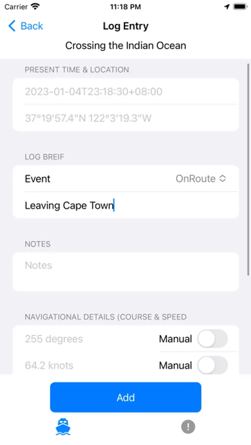 Easily keep a log of all your boating trips. Position, course and speed captured automatically, and many other data fields easy and quick to populate through assisted selectors.