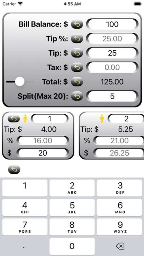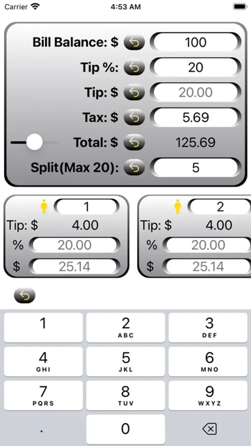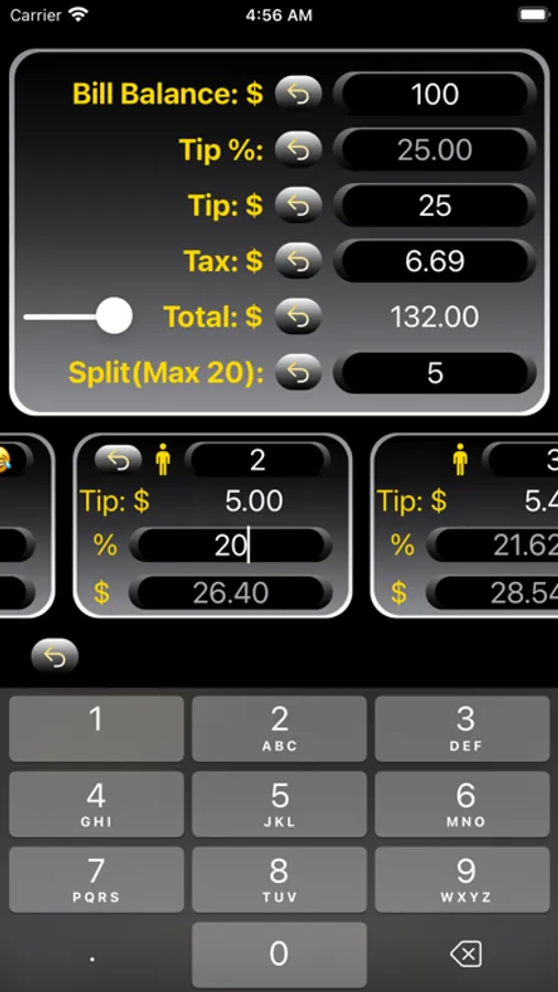 - Customizable bill split amount by percentage or $ amount per individual