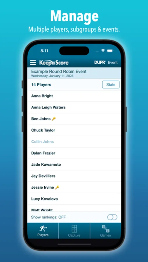 Player ranking features allow for more competitive and fair play. You can use the included community ranking feature — explained within the app — or import data from popular ranking services like DUPR®.