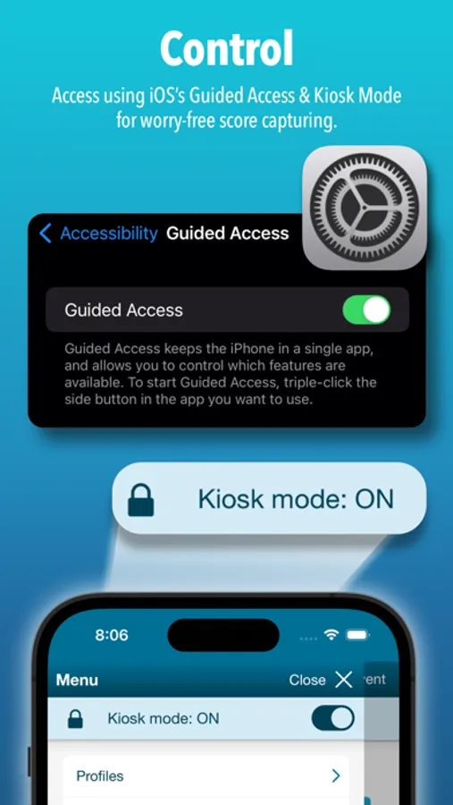 When combined with the iOS native feature of Guided Access, you can lock both the app and the user interface into "kiosk mode". This allows your iPad/iPhone to be used by all players of a pickleball event for the perfect pickleball score keeper.