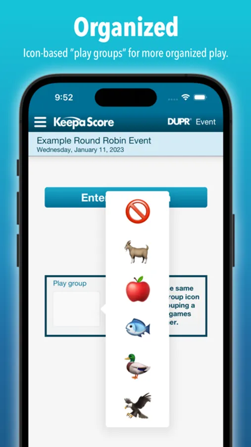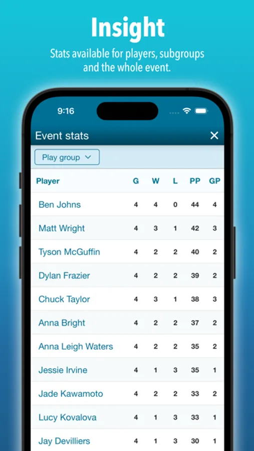 By using a single icon, coined by KeepaScore as a "play group", players can play as many games as necessary within that play group to facilitate whatever format is being played. KeepaScore will collect scores and report on the statistics by player, team or both. You can use KeepaScore for almost any tournament type.