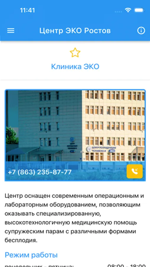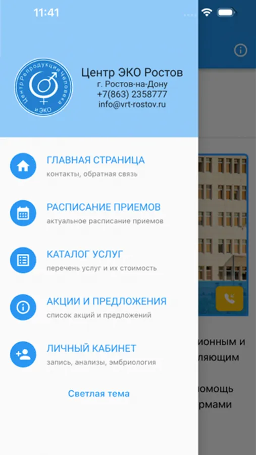 Приложение «Центр ЭКО Ростов» предназначено для дополнительного информирования пациентов о деятельности, услугах, графике приемов ООО «Центр репродукции человека и ЭКО», г. Ростов-на-Дону, также приложение предоставляет доступ в личный кабинет пациента, с помощью которого он может ознакоминтся с результатами анализов, записаться на прием, получать сообщения эмбриологов.