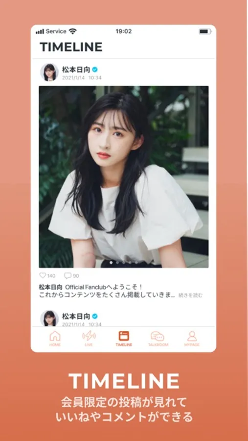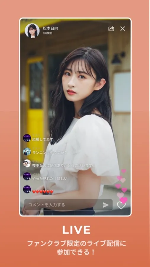 【松本日向Official Fanclub ひなたぼっこ】とは、松本日向のLIVE配信や投稿などをスマートフォンからいつでも気軽に楽しむことができる、エンターテイメントサービスです。