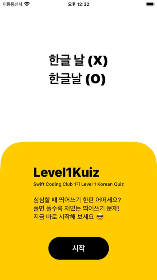 Swift Coding Club 1기 프로젝트 Kuiz(퀴즈)는 Korean Quiz의 줄임말이에요. 사람들이 글을 쓸 때 많이 틀리는 띄어쓰기를 게임으로 만들어 봤어요. 게임을 하다 보면 여러분은 맞춤법 더듬이에서 빠져나올 수 없을 거예요. 심심할 때 띄어쓰기 한판 어떠세요? 지금 바로 시작해 보세요!
