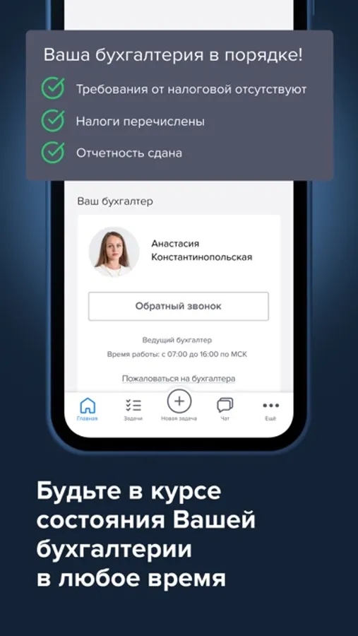 Первая экспертная бухгалтерия - вы просто ставите задачи ассистенту и присылаете фото документов в приложении. Приложение позволит вам в любое время быть в курсе нужных вопросов по вашей бухгалтерии.