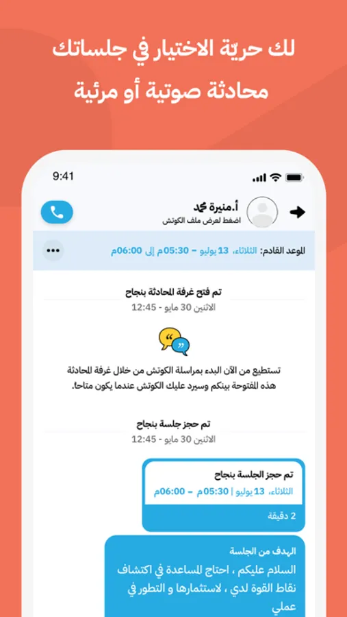 -جلسات الكوتشنج: جلسات مجدولة أو مباشرة بأوقات مرنة لتناسب احتياجك.