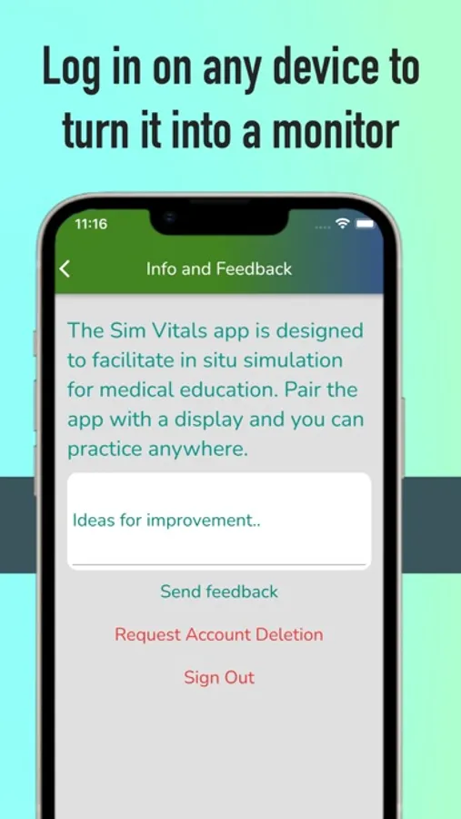 Our vital sign simulation app is an innovative tool for in situ medical education. With our app, you can use your phone as the controller and any other device as the display monitor.