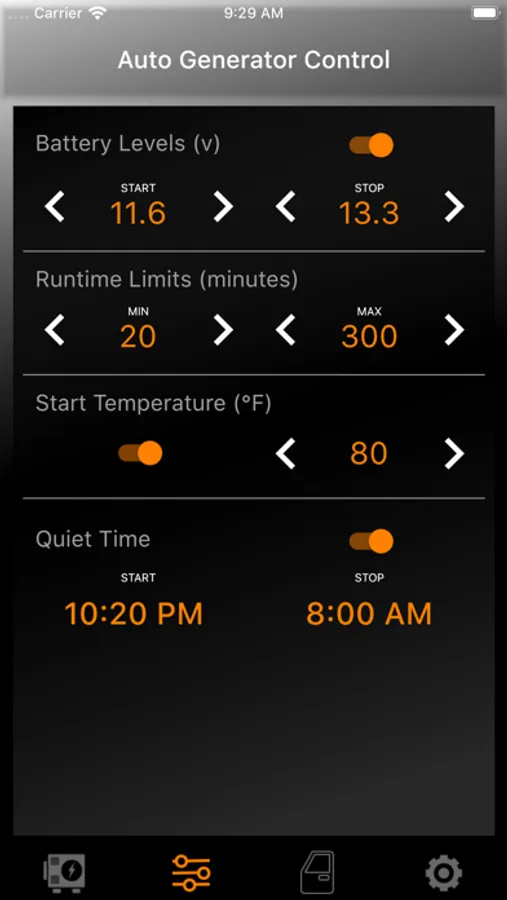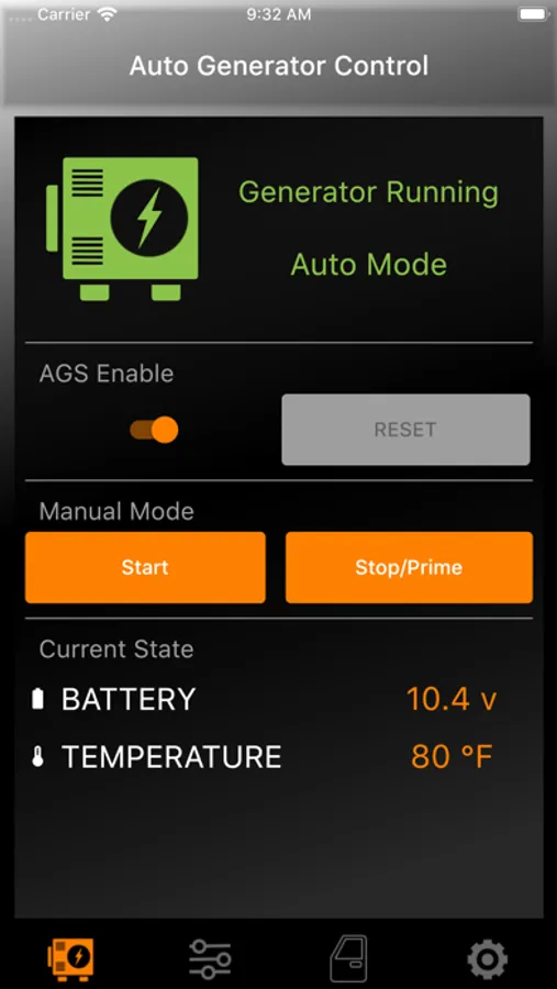 * Auto generator start / stop (based on preset temperature level and battery voltage level)