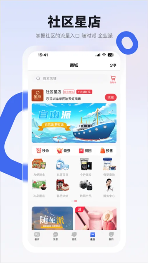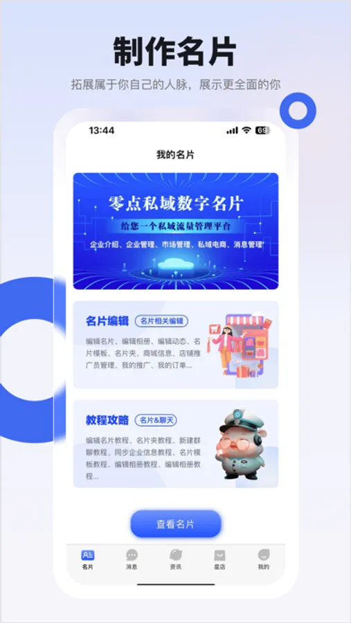 零点私域APP是一款以私域为主题的移动手机应用平台,集名片、聊天、资讯、商城于一体,用户可以根据APP拓展属于自己的私域空间。