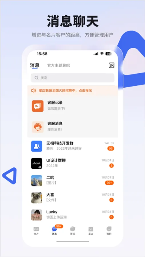 聊天板块更是可以与名片的客户沟通交流更加方便,以便引导用户对APP产生依赖感,聊天界面更有群会议、签到、文件传输等功能,更加方便管理用户,单人聊天时可进行加密更具有隐私性,更好的保护了用户的隐私安全,防止聊天记录被截图进行传播等用途。