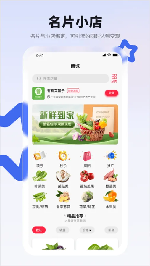 商城营销板块分为预售专区、交易广场、特价秒杀、全民拼团及振兴乡村几大板块,商城中购买的转售商品可以在聊天界面中以红包的形式用作礼品订单发送给好友,实现线上云送礼.