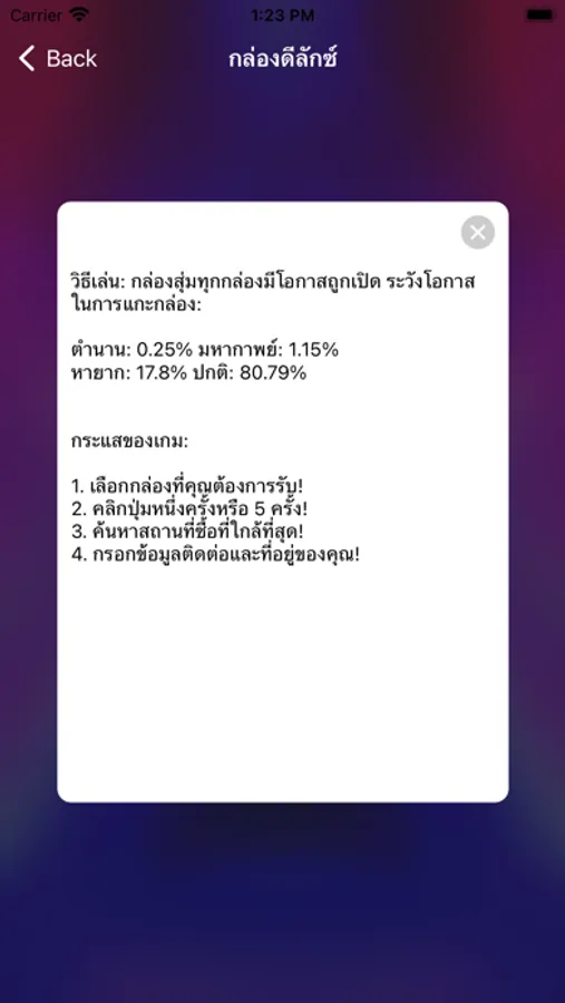 คุณสามารถใช้แอพเพื่อดูกระบวนการเฉพาะในการซื้อกล่องและผลิตภัณฑ์รวมถึงข้อมูลผลิตภัณฑ์ล่าสุด เรายืนยันที่จะทำร้านขายแบบออฟไลน์ หลังจากเรียนรู้เกี่ยวกับผลิตภัณฑ์ของเราผ่านแอพแล้ว คุณสามารถไปที่จุดขายผลิตภัณฑ์ที่ใกล้ที่สุด จะซื้อแกะเปิดกล่องก็ได้ของราคาสูงก็มีโอกาสได้ของราคาต่ำเหมือนกันนี่โชคเต็มจอรับประกันสินค้าที่เราขายเป็นของธรรมดาทั้งหมด !