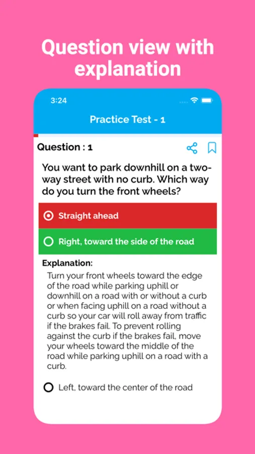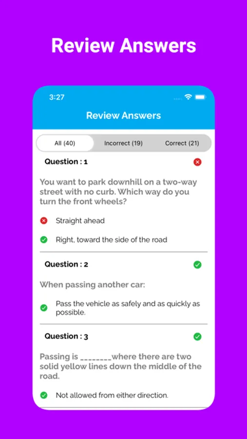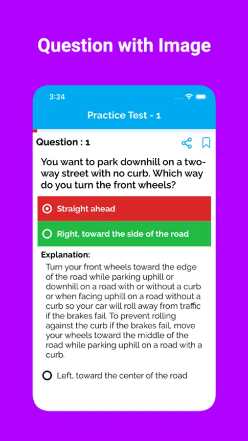 Our app includes a variety of practice questions for the Driver's license exam for Car, Motorcycle and Commercial Vehicles. These questions are based on the official handbook of different states.