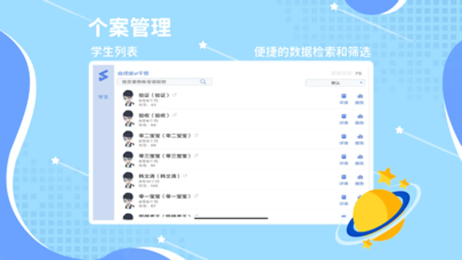 星智数疗聚焦孤独症治疗,在医院或干预教育机构场景,为医生、教师提供专业可信赖的数据展示与保存服务,致力于更方便检索数据、更清晰呈现数据、更安全的存储数据,为医生或教师对个案后续的治疗和干预提供帮助。