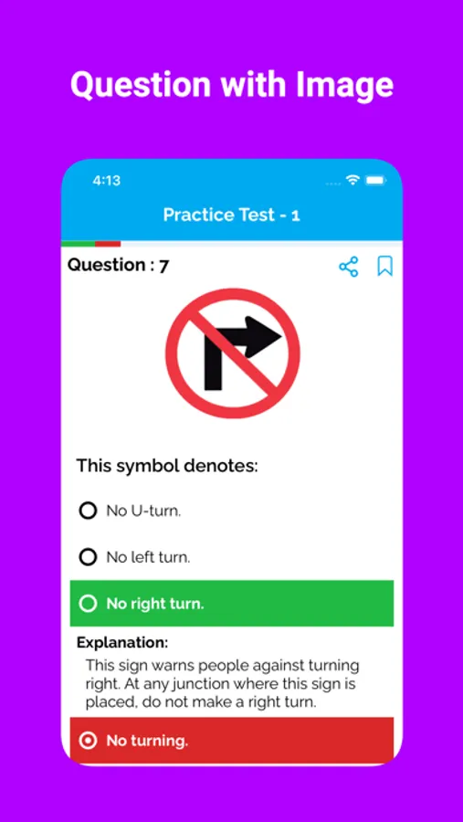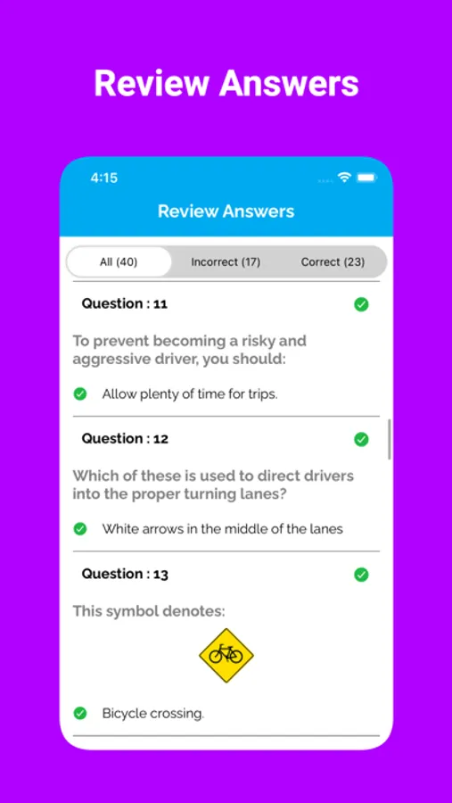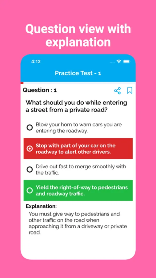 Our app includes a variety of practice questions for the Driver's license exam for Car, Motorcycle and Commercial Vehicles. These questions are based on the official handbook of different states.