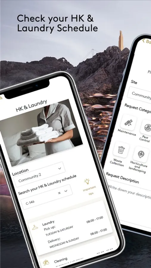 This application is providing a service for residents who live in NEOM Communities where users can check bus schedules, community updates, events, housekeeping and laundry schedule, and cinema schedule. Also, it will help all residents to report a maintenance issue or request a new service for example if one of the residents wants to request water for his or her unit or if a residents want to install new furniture in his unit.