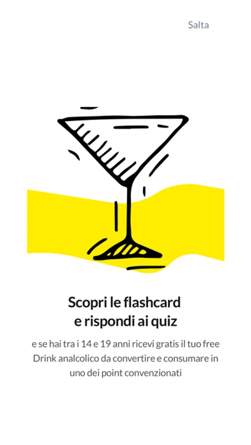 Scopri le flashcard e rispondi ai quiz. Se hai tra i 14 e 19 anni ricevi gratis il tuo free drink analcolico da convertire e consumare in uno dei POINT convenzionati.