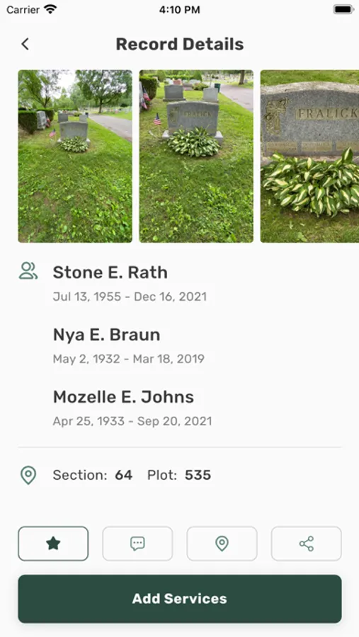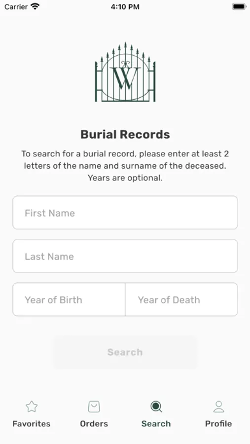 Woodlawn Cemetery App allows users to search a definitive collection of burial records and get basic information about relatives interred here. After registration, you can contact the cemetery, add records to favorites and order aftercare services.