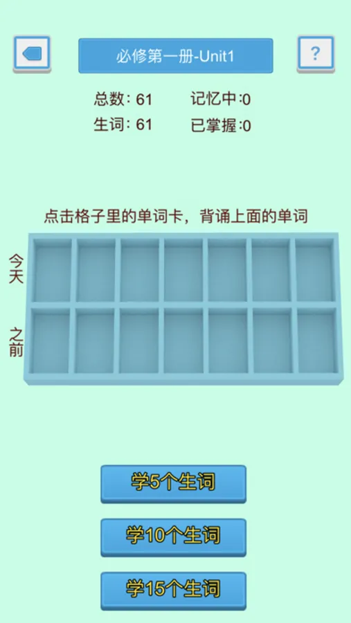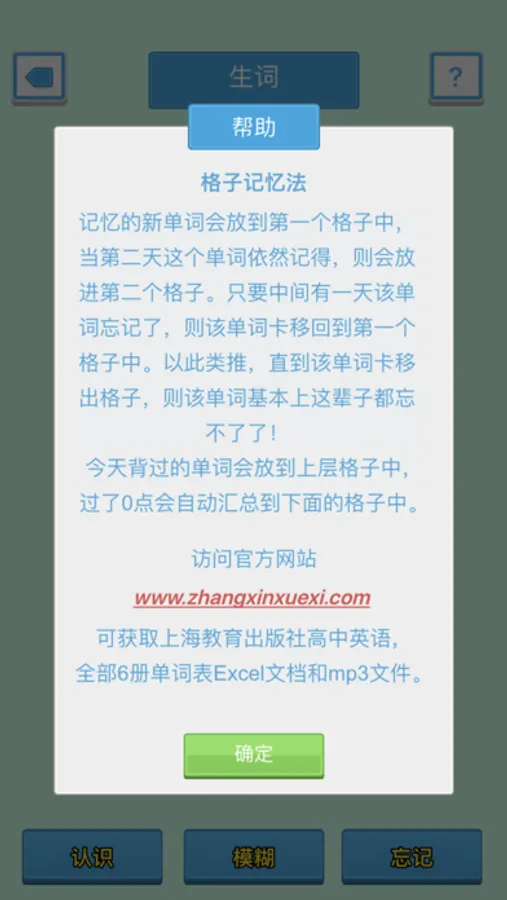 目前已收录《沪教版高中英语教程》,与课本中每个单元的单词一一对应,通过格子背单词的方法,强化记忆,每天背3词,每次5分钟,坚持把所有的单词都移动到最右侧的格子中,即表示你掌握了这本书中所有的单词了,恭喜你,这辈子都很难忘记了!