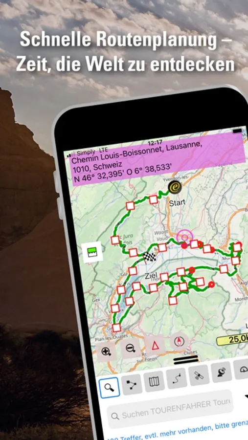 Mittels integrierter, leistungsstarker Suchfunktionen müssen Sie Adressen, Wegpunkte, Routen, TOURENFAHRER-Touren und Tracks nicht lange suchen, sondern können direkt losplanen oder fahren.