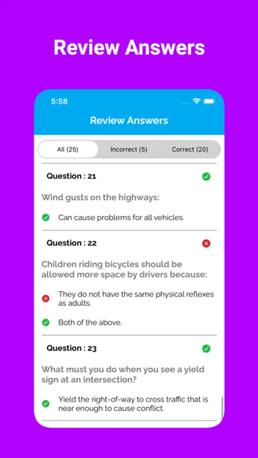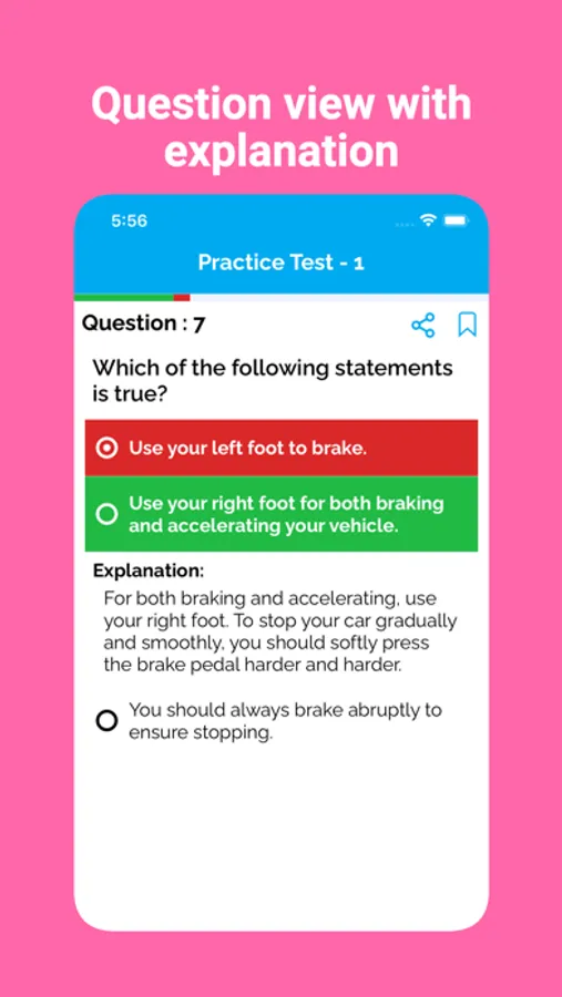Our app includes a variety of practice questions for the Driver's license exam for Car, Motorcycle and Commercial Vehicles. These questions are based on the official handbook of different states.