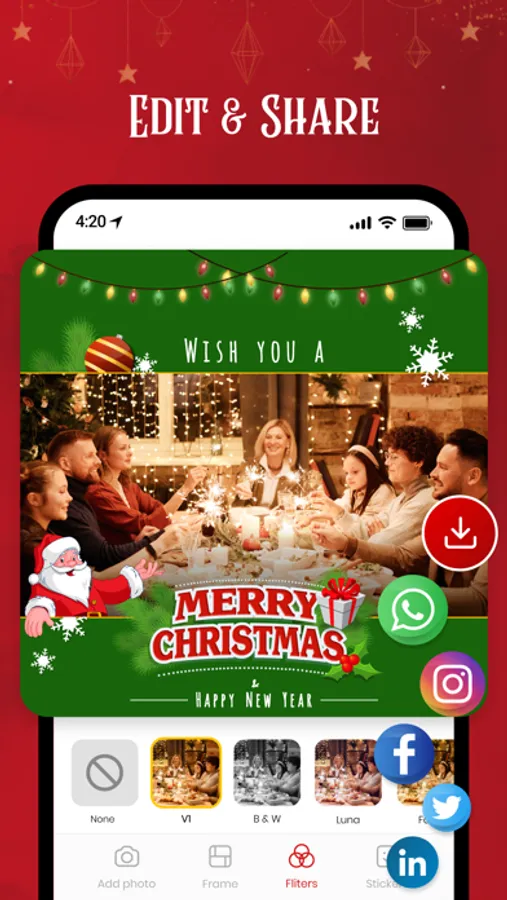 - Apply various color effects and image flip features into the Christmas frames for photos.