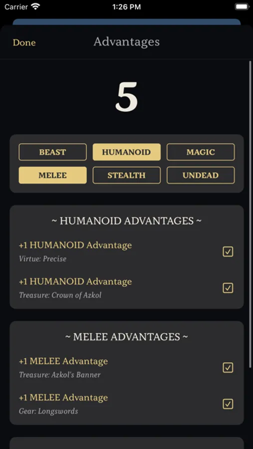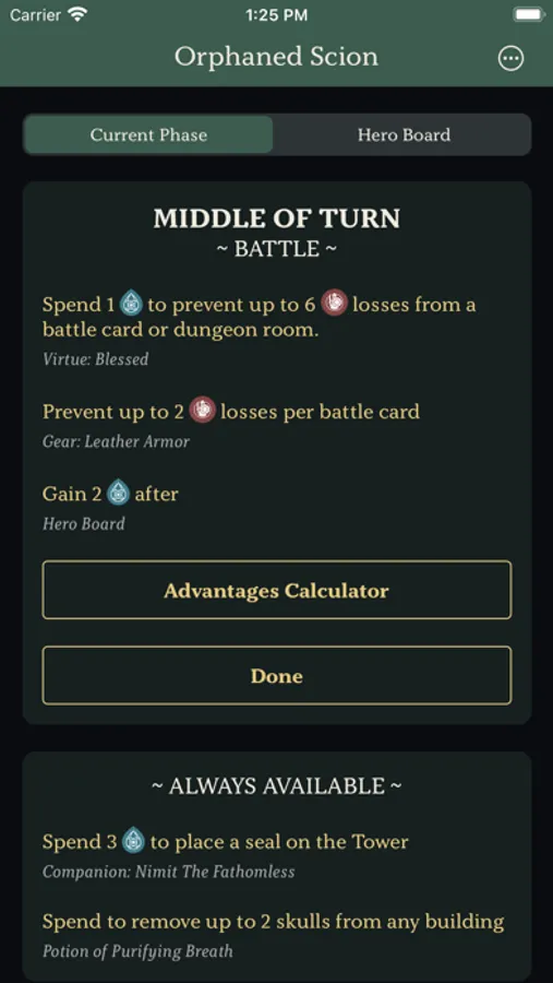 - Advantages calculator: easily see how many Advantages you have based on the cards on your hero board