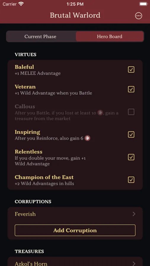 - Recreate your hero board including virtues, corruptions, treasures, companions, potions, gear, and quest items