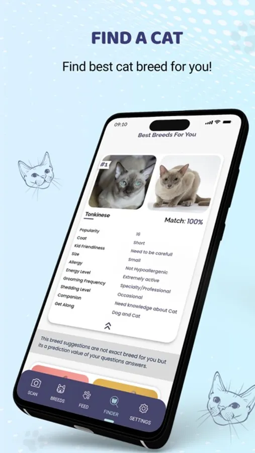 Not sure which Cat breed is right for you? No problem! Simply answer a few questions about your lifestyle, living situation, and preferences, and Cat Finder feature will suggest the best cat breeds that match your needs. Cat Identifier features a comprehensive database of over 70+ Cat breeds, with detailed information about each breed's personality, energy level, size, and grooming requirements. This information will help you make an informed decision about which breed is right for you.