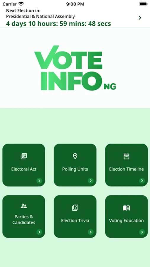Know everything about the Nigeria electoral law and details about the upcoming elections, such as voting dates, voter requirements, political parties, candidates, polling units, and other related information. VoteInfo NG is your one-stop app to inform and educate you about the Electoral Act and elections in Nigeria.