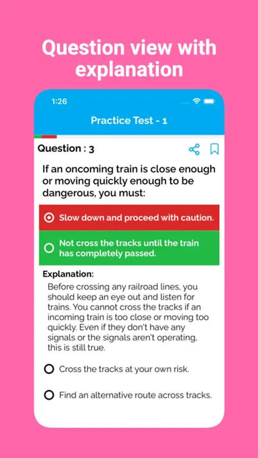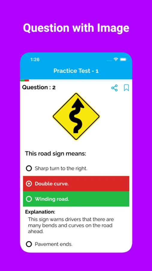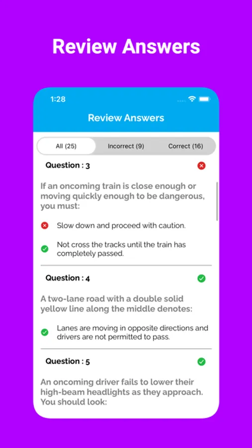 Our app includes a variety of practice questions for the Driver's license exam for Car, Motorcycle and Commercial Vehicles. These questions are based on the official handbook of different states.