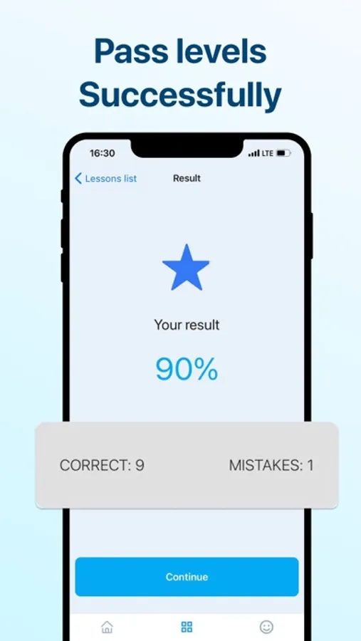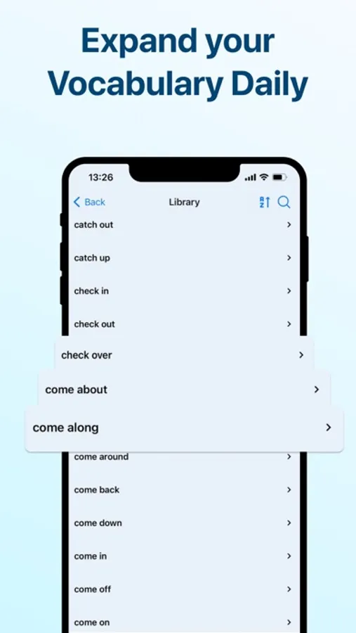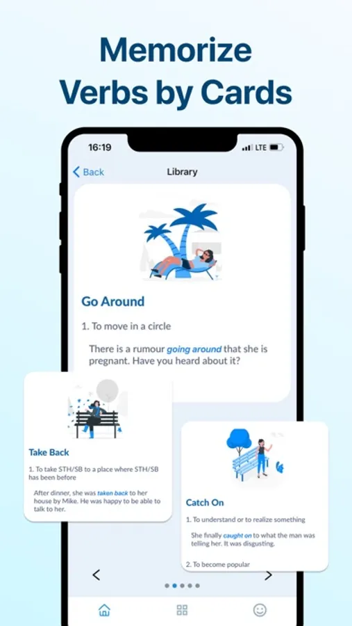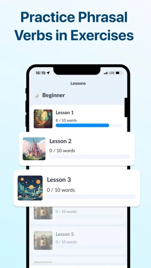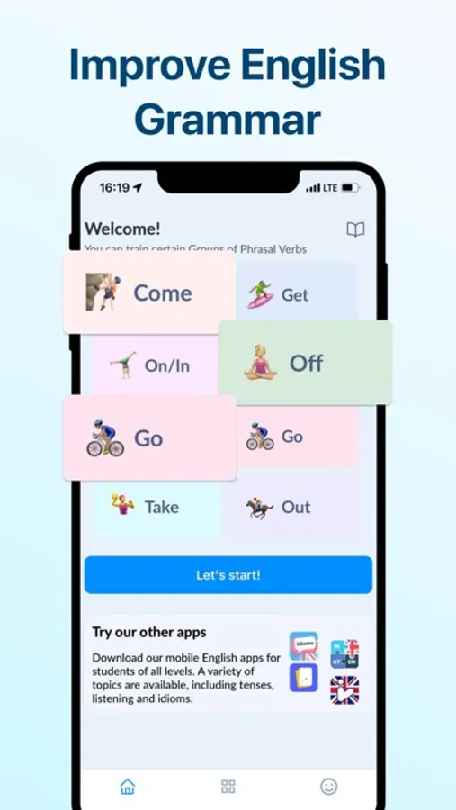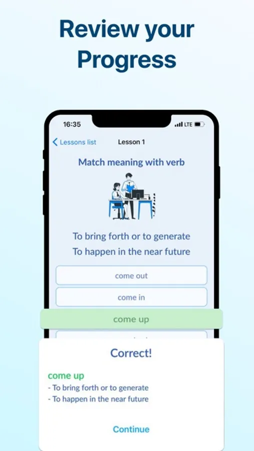 While learning English phrasal verbs, you will test your knowledge by taking tests in which you are asked to choose the correct phrasal verb or part of it. Upon completion of the test, the application shows you the result.