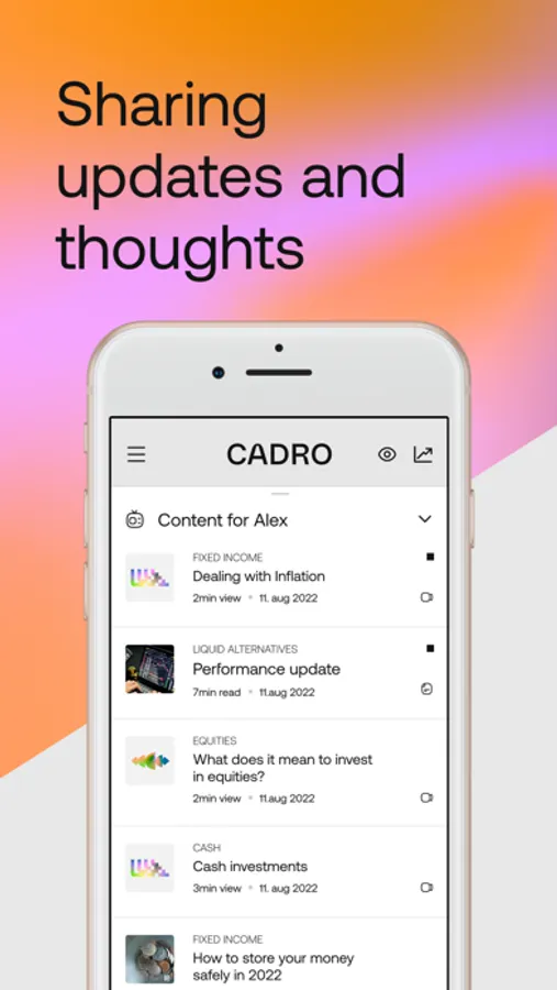 Through regular updates and personalised in-app content, Cadro keeps you engaged with the market and informed of changes so you can easily analyse the journey of your investments in real time.