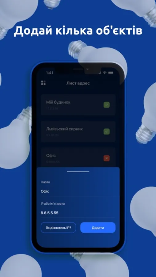 Ви можете додати кілька об'єктів і відстежувати дані одночасно. Це буде корисно, щоб дізнатися, чи є світло вдома, на офісі або в улюбленому закладі.
