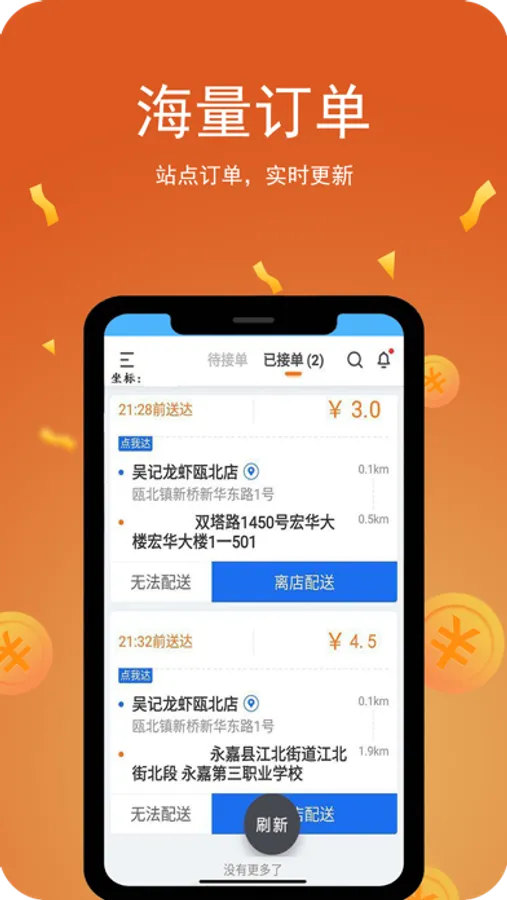是一款具有抢单,取货,配送,以及配送记录的一款专用配送人员打造的APP,支持新订单语音提醒,路线导航等一系列使用功能,方便配送人员使用!