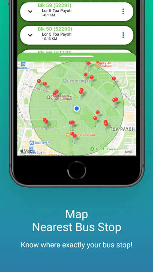 App automatically detects your location and shows you the nearest bus stop and its bus service.