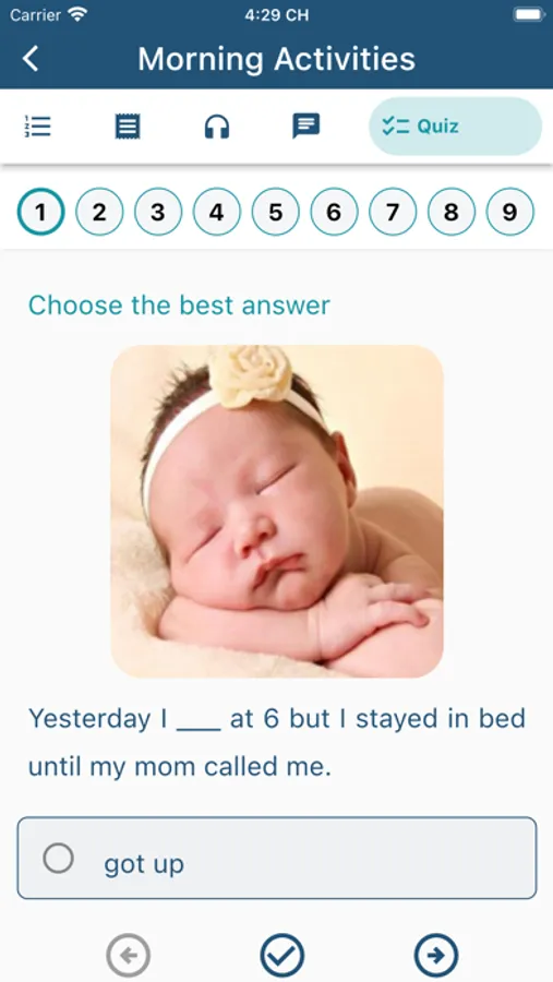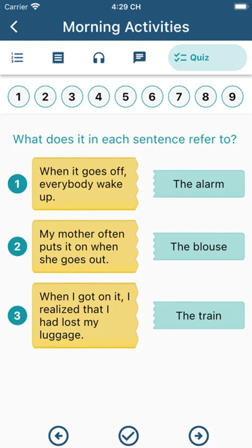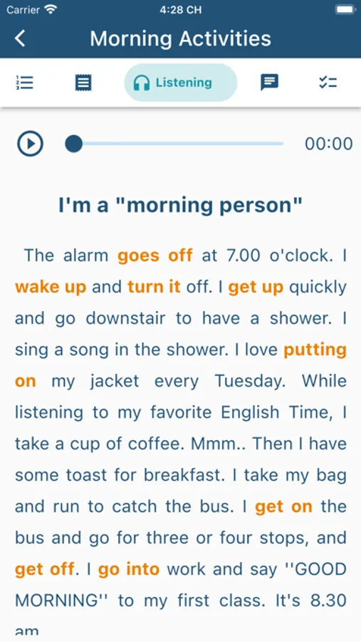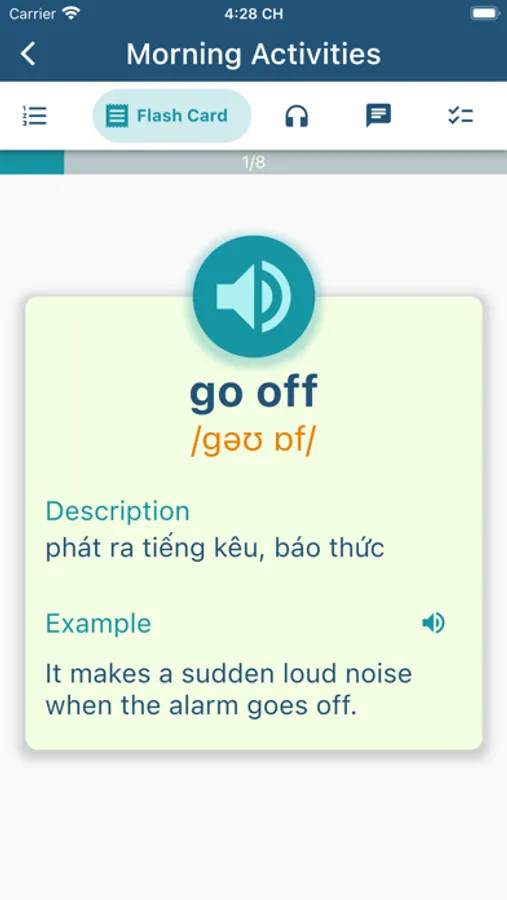 There are many exercises in the app for memorizing new words. There are flashcards with the phrasal verb in the first part of the lesson. You can listen to the correct pronunciation, and take a look at the definitions and up to ten usage examples. If you already know this phrasal verb, you can skip it and proceed with the next one. After that, you should pass a test to consolidate already learned phrasal verbs to define your weakest points. In the third part of the lesson, you need to complete a sentence, which contains the learned word, using words in the right order.