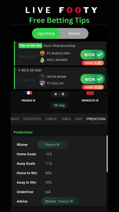 Receive insightful predictions and tips for recent and upcoming matches, complete with detailed information.