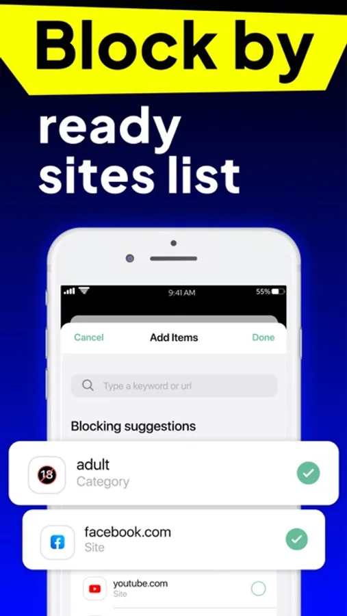 In addition to adding sites manually, our app offers the option to select from predefined categories and block thousands of websites with one swipe. You can decide whether you want to block entire categories or just specific websites and apps!
