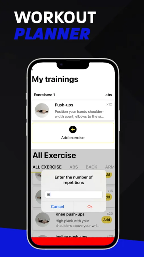 Access our extensive exercise library and create custom workouts from scratch. Start a new training by giving it a name. Then add any of the exercises which are neatly divided by muscle group. Specify the number of repetitions for each exercise too.